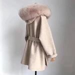 Details: Belted around the waist with two visible pockets on each side, Hoodie with removable Fox fur