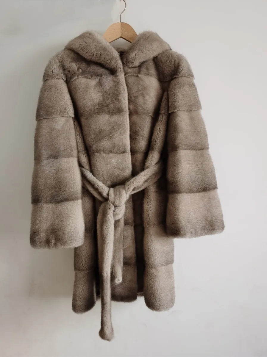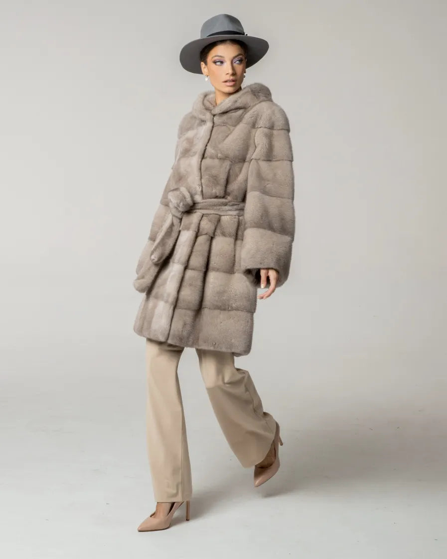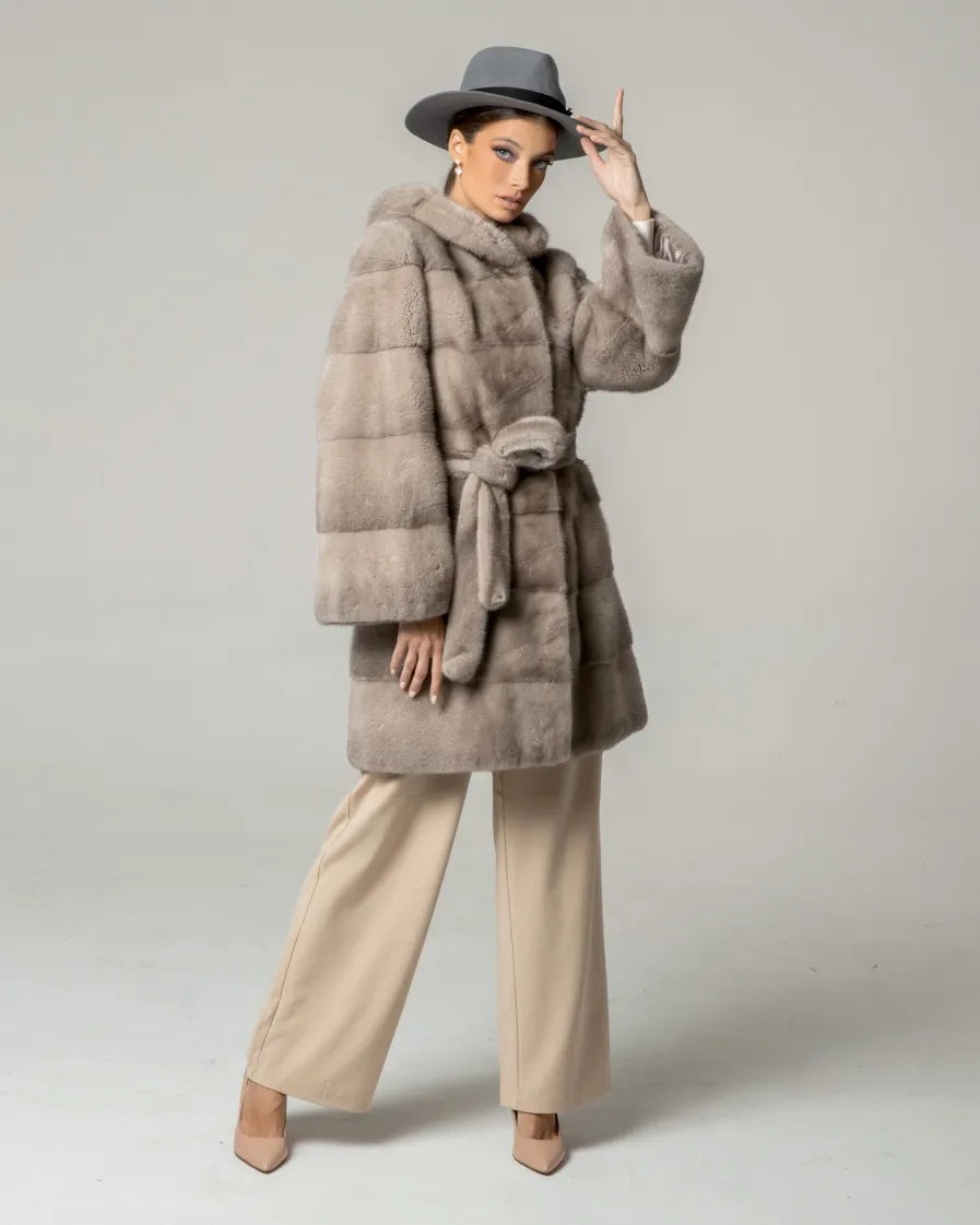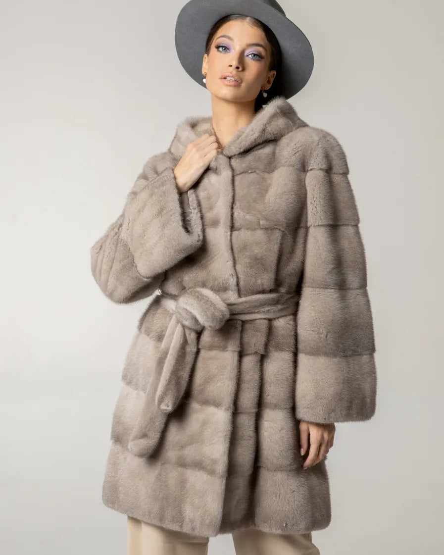 The GRETA Mink Coat is a premium piece that embodies elegance and sophistication. Crafted from luxurious mink fur, this coat features a wide hood and bell sleeves, adding a touch of modern flair to its classic design. The GRETA Mink Coat comes with a belt that cinches at the waist, accentuating your silhouette while providing warmth and comfort. Allows you to personalize your style and perfectly match your wardrobe. The coat's silk lining enhances its luxurious feel, making it an ideal choice for any occasion. Whether you're dressing up for a special event or adding a touch of refinement to your everyday look, the GRETA Mink Coat is sure to make a statement.