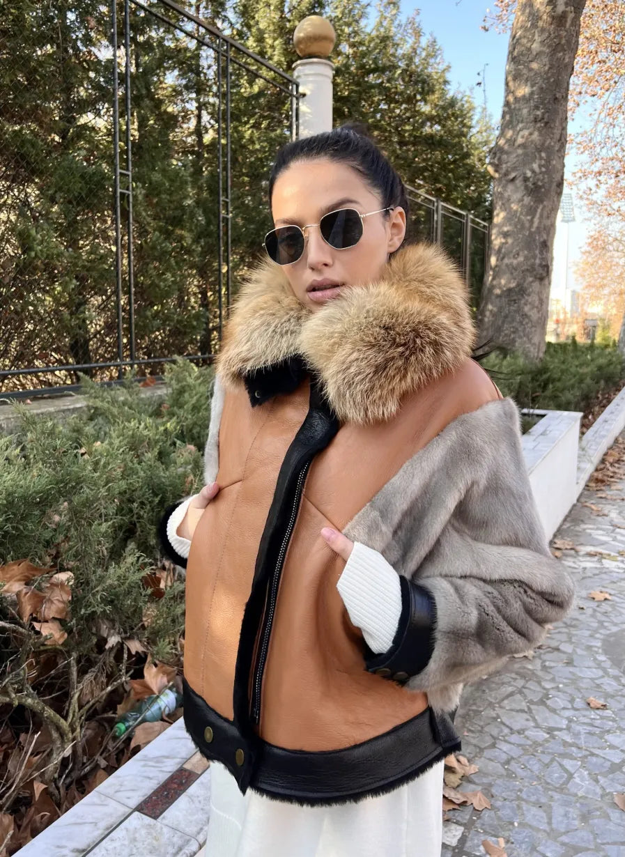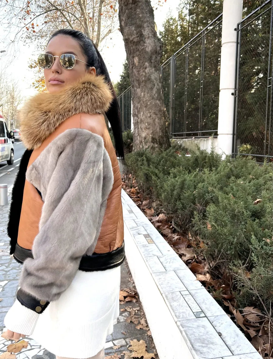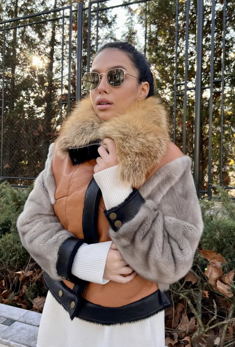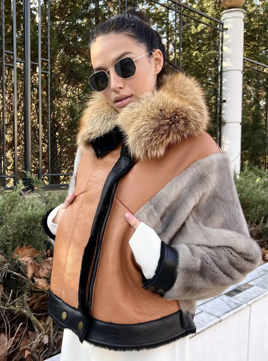Material: Mink sleeves, Leather base, Red fox collar