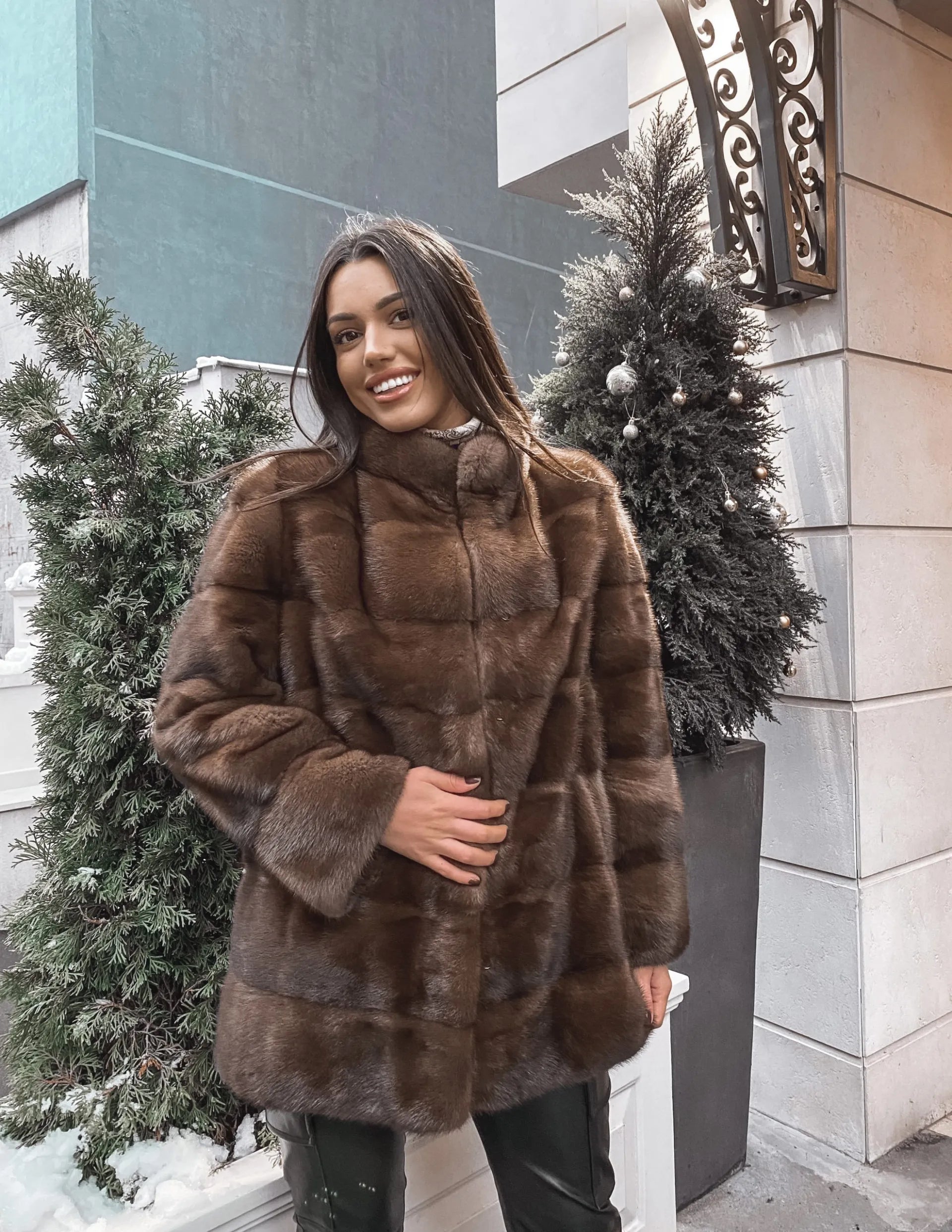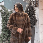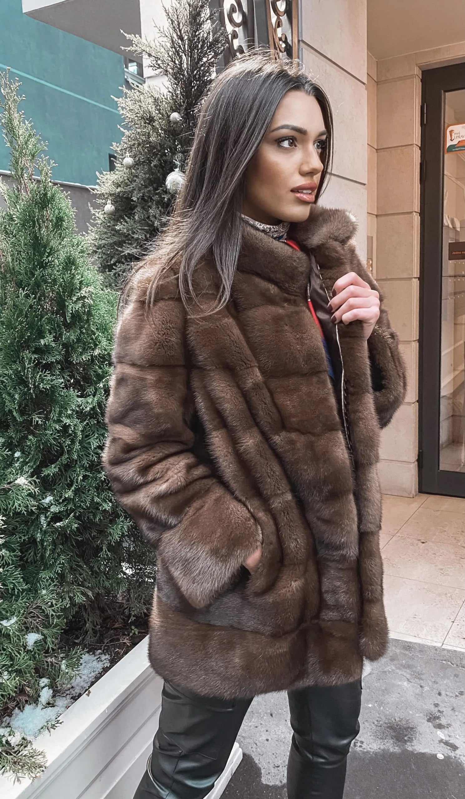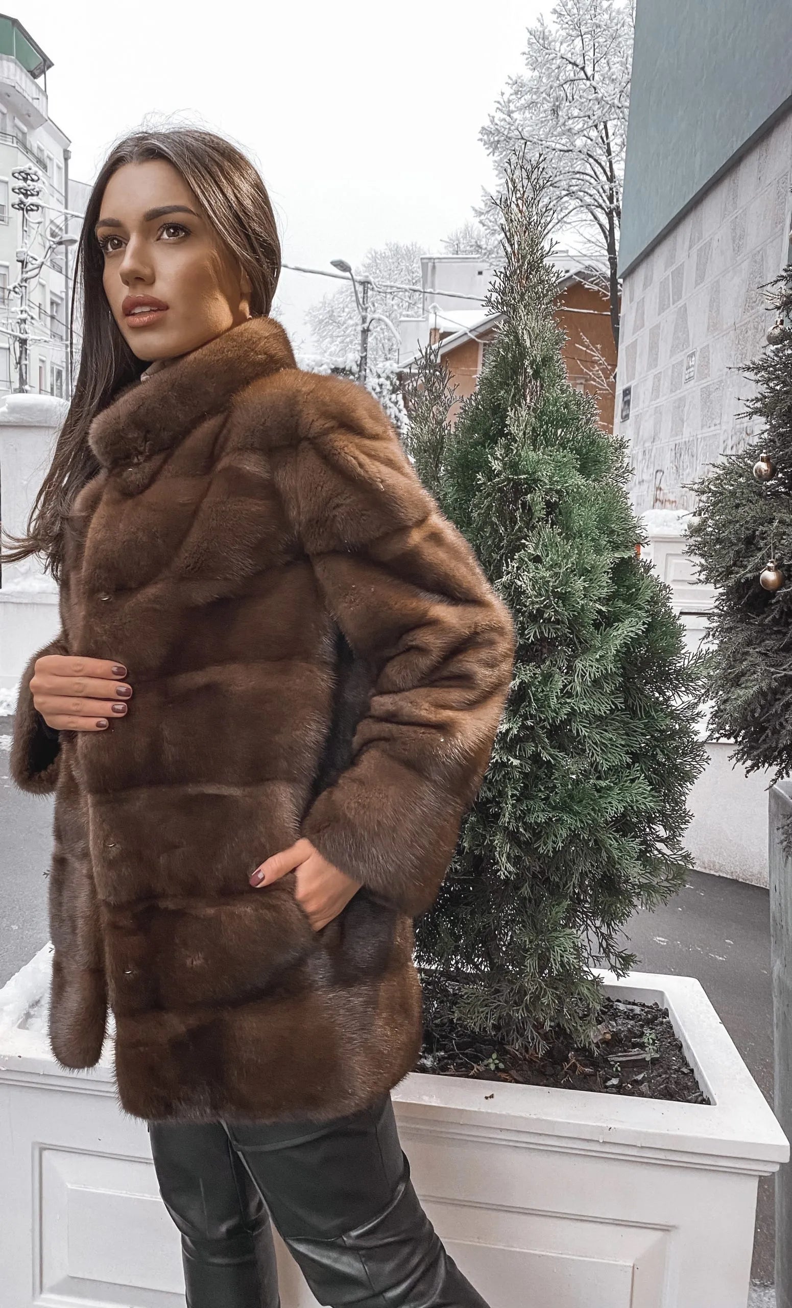 The LEONA mink fur coat is a premium piece that embodies timeless elegance and sophistication. Designed to make a statement, this coat features an extended collar that adds a distinctive touch of seriousness. Its unique sleeve cut sets it apart from other garments, highlighting its authentic design and offering a canvas through which you can express your personal style. The LEONA coat is the ultimate embodiment of luxury and refinement.