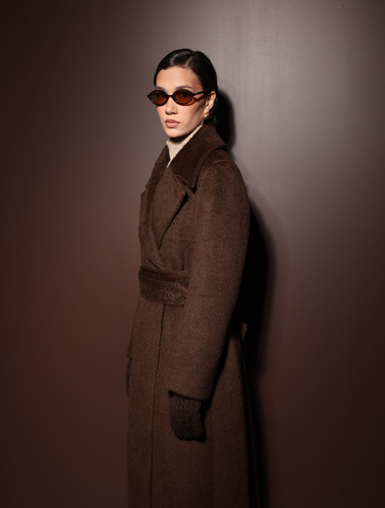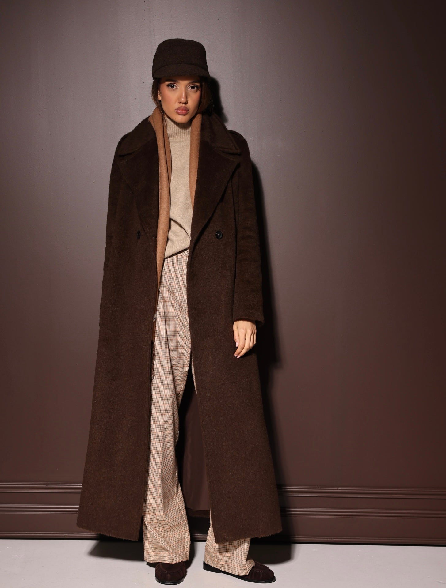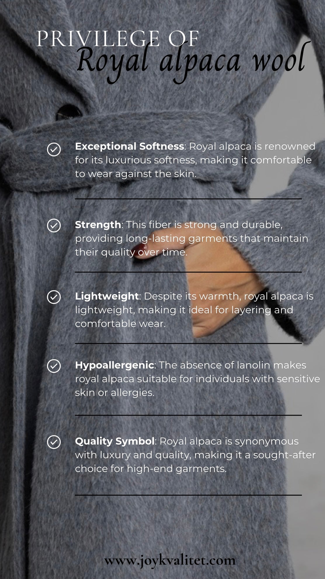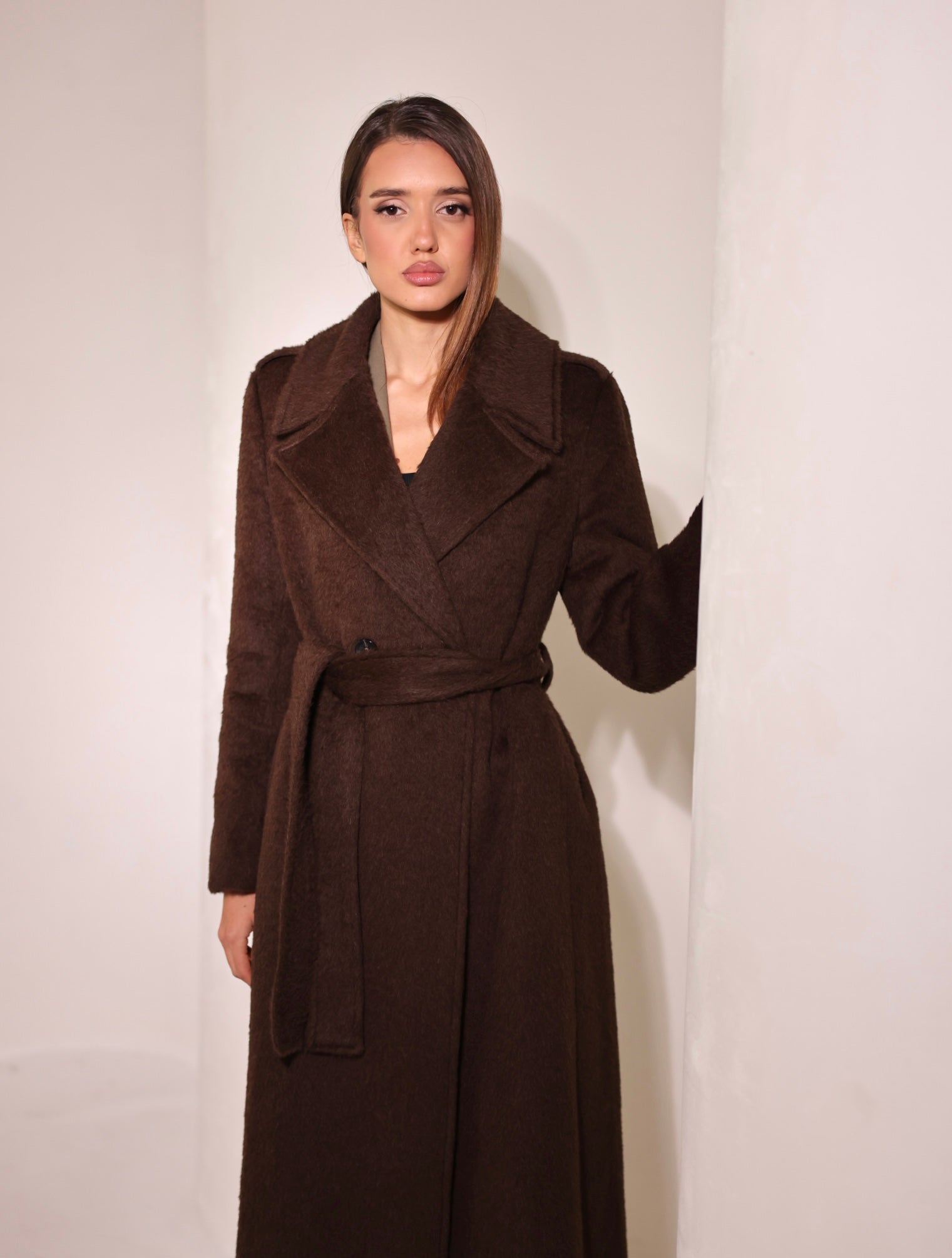 The JOY royal alpaca wool coat exudes elegance and exclusivity, showcasing the refined qualities of this extraordinary material. Renowned for its lightweight warmth, softness, and durability, alpaca is a luxurious choice that provides exceptional comfort and sophistication. The coat’s perfectly tailored shoulders enhance its silhouette, offering a flattering and polished look. Its versatile brown hue pairs effortlessly with any color, making it easy to style for any occasion. Elevate your wardrobe with this timeless piece, embodying a perfect blend of luxury and practicality.