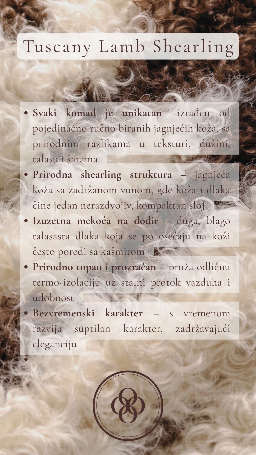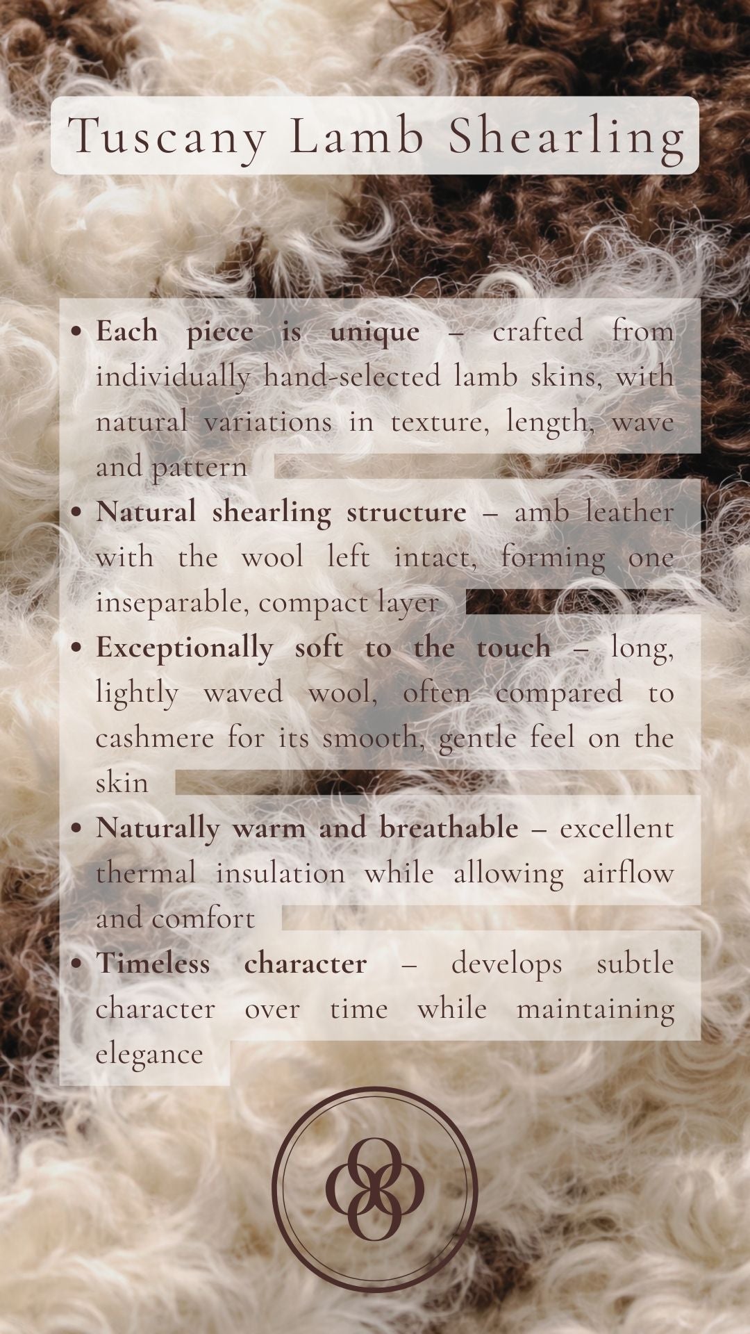 Each piece is truly one of kind, crafted from premium Tuscany lamb shearling, this piece offers exceptional softness, natural warmth and a refined, luxurious texture. The long, lightly waved wool creates an elegant silhouette while providing outstanding comfort and breathability. Designed for both style and practicality, it is a timeless investment for colder season.